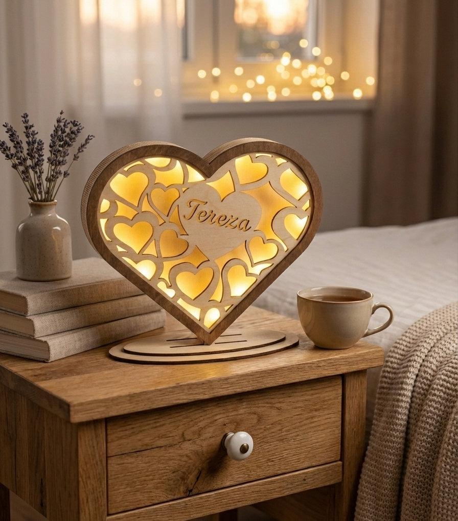 ✏️ Originální dřevěná LED lampička ve tvaru srdce s možností vlastního jména nebo textu. Teplé světlo, stmívání a poctivé zpracování z překližky a HDF z ní dělají krásný osobní dárek pro výjimečné chvíle.